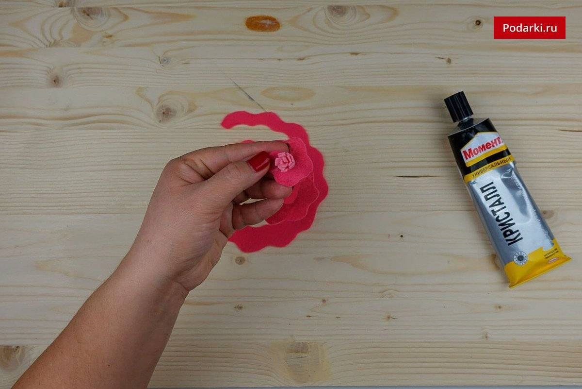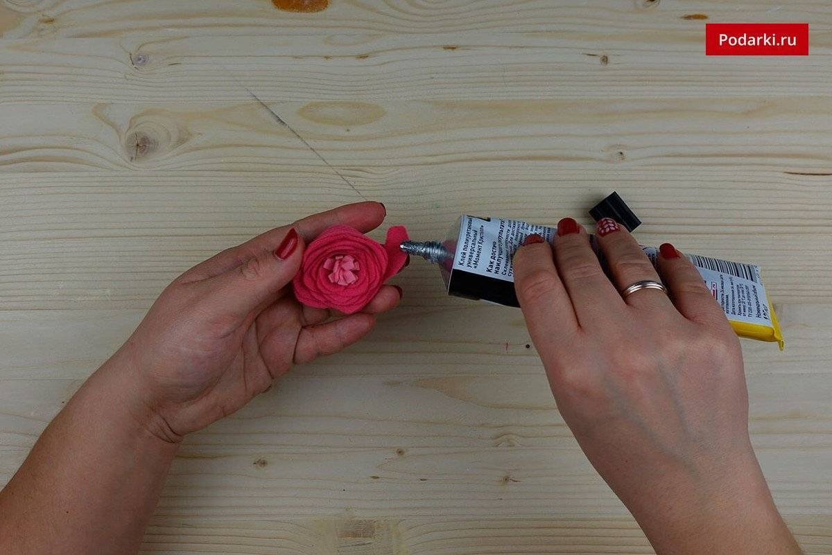 Шаг 6. Как только роза достигнет желаемого диаметра, опустите оставшийся хвостик ленты вниз и приклейте его к основанию.