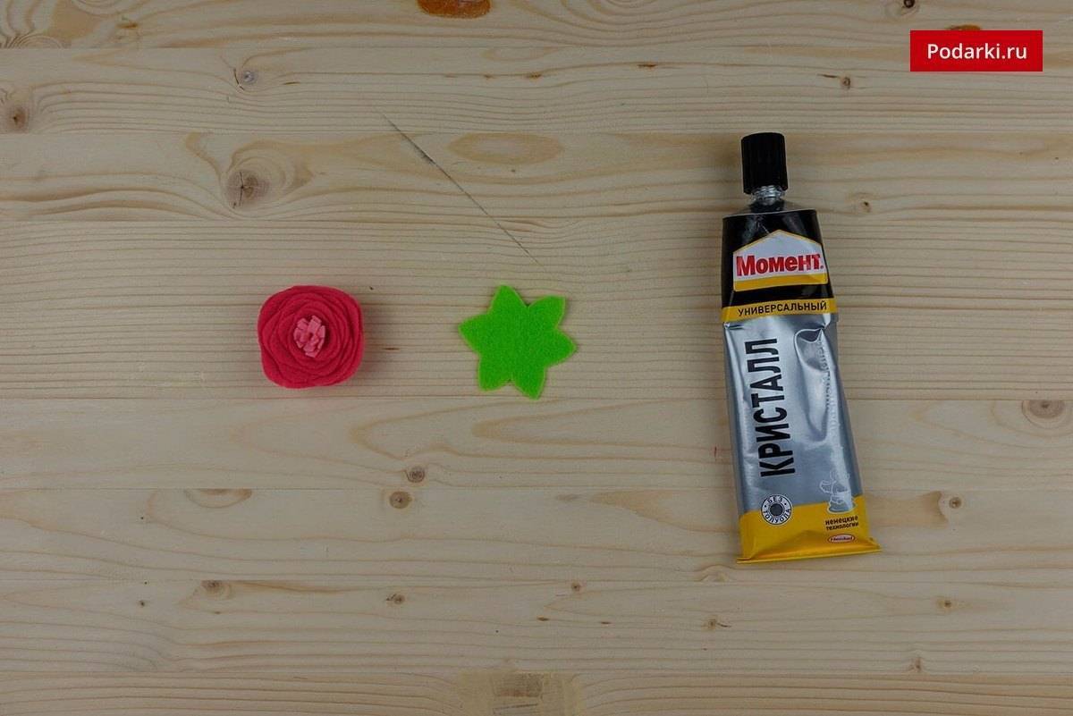 Цветочки создаются из атласной ленты, с помощью клея «Момент-Кристалл», декоративных элементов, картона, ножниц и нитки с иголкой.