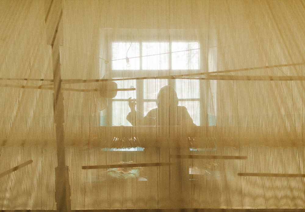 На ткацком станке, который находится в середине дома, натягивают белые нитки. Они служат своеобразной канвой, с помощью которой будет выткан рисунок. На этой основе разноцветными нитками начинают завязывать узелки, которые постепенно приобретают законченную форму.