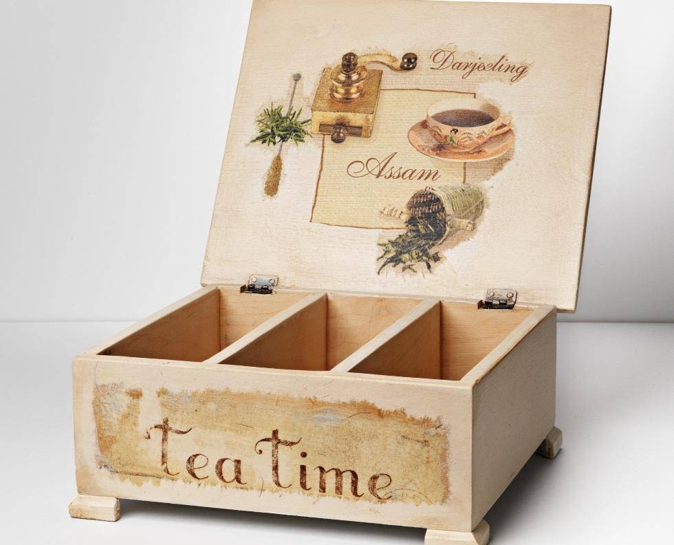 Тканевыми картинками можно украшать любое деревянное изделие. Альтернативой подарка в виде бутылки шампанского станет красивая деревянная шкатулка, оформленная в технике декупаж.