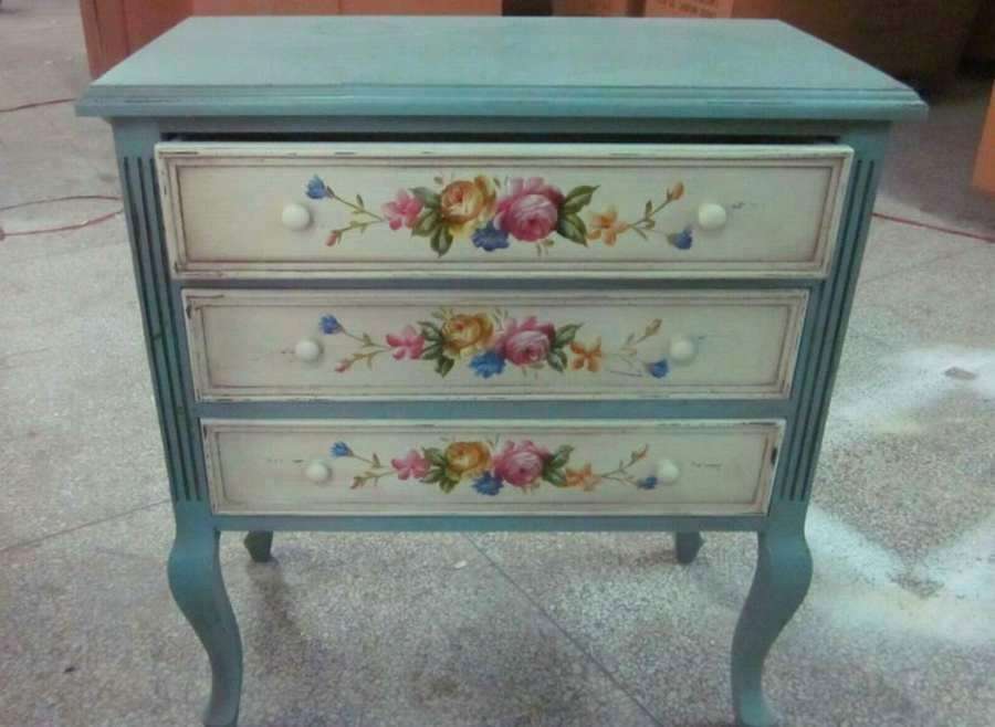 Роспись на комоде можно разместить на фасадах ящиков, столешнице и на боковинах. Хорошо будет смотреться эффект естественного выгорания мебели под солнечными лучами. Для стиля прованс применяется техника состаривания покрытий.