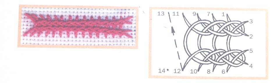 В точке 3, расположенной на верхней грани шва и правее точки 1, игла выходит на лицо. Далее выполняется горизонтальный стежок (3-4) вправо на верхнюю грань шва. Стежок 3-4 сильно не затягивается. Игла вкалывается в точку 4, расположенную на верхней грани шва и отстоящую от правой линии шва так же, как точка 3 отстоит от левой линии шва. В точке 4 игла уходит на изнанку, где делает горизонтальный стежок (4-5) влево. В точке 5, расположенной на верхней грани шва и отстоящей от правой линии шва так же, как точка 2 — от левой линии шва, игла выходит на лицо. Расстояния 3-2, 5-4 равны между собой. Следующим выполняется диагональный стежок (5-6) вниз и вправо на правую линию шва. Игла вкалывается в точку 6, расположенную на правой линии шва на уровне точки 1. В точке 6 игла уходит на изнанку, где делает диагональный стежок (6-7) вниз и влево на левую линию шва. В точке 7, расположенной на левой линии шва под точкой 1, игла выходит на лицо. Затем выполняются две петли шва. Первая петля обхватывает левое перекрестие стежков (1-2) и (3-4), вторая петля — правое перекрестие стежков (3-4) и (5-6). Игла вкалывается в точку 8, расположенную на правой линии шва под точкой 6. В точке 8 игла уходит на изнанку, где делает диагональный стежок (8-9) вниз и вправо на правую линию шва. В точке 9, расположенной на правой линии шва под точкой 7, игла выходит на лицо. Отрезки 1-7, 7-9, 6-8 и т.д. равны между собой. Далее от точки 9 шов выполняется так же, как от точки 7.