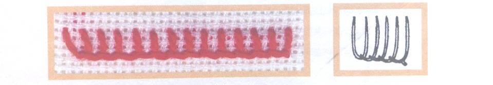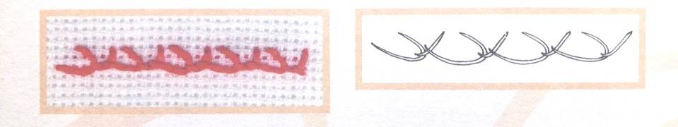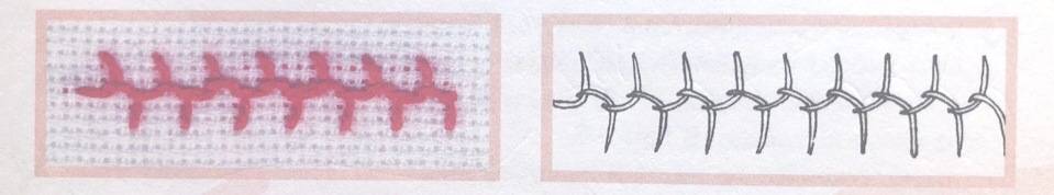 Шов «галочки» (вариант 4-2. 1 2) является разновидностью шва «петельный» (4-2), с той лишь разницей, что свободные концы петель шва смотрят не в одну, а в разные стороны.