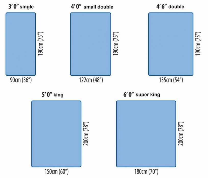 1,5 спальные – промежуточный размер: комфортная односпальная кровать или тесная двухспальная шириной от 120 до 160 см. Длина 190-220 см.