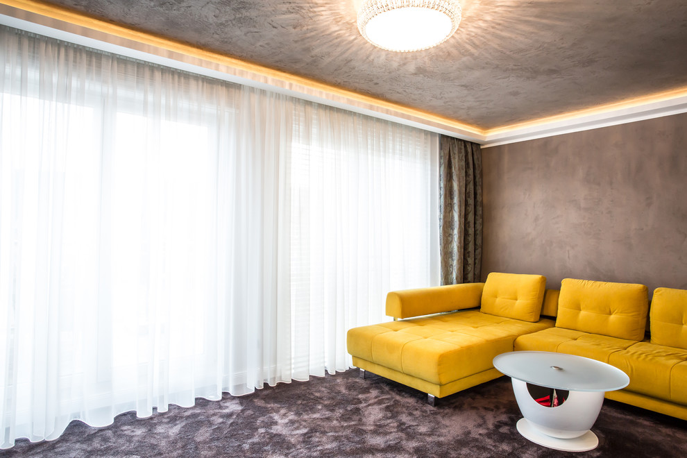 Декоративный шнур сочетается со всеми видами стеновых покрытий и потолочных фактур. Окантовка крепится и на горизонтальных, и на вертикальных участках (например, вдоль гипсокартонного короба или нижнего яруса двухуровневого потолка). Вставка становится ярким и современным акцентом в интерьере.