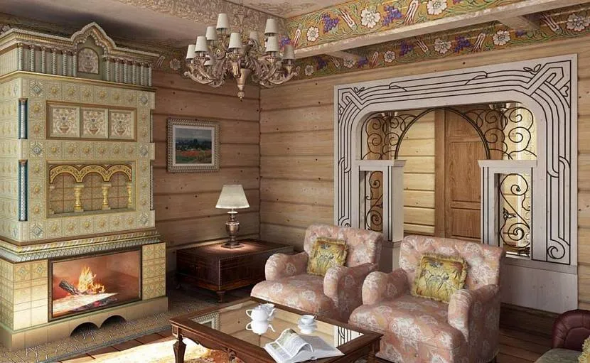Занавески в русском стиле изготавливают из простых домотканых тканей. Отличным решением будет однотонный ситец или материя с мелким рисунком. Полотно декорируют вышивкой в виде стилизованных изображений с птицами, растениями, людьми или геометрическими фигурами. Маленькие оконные проемы драпируют короткими занавесками с кружевами.