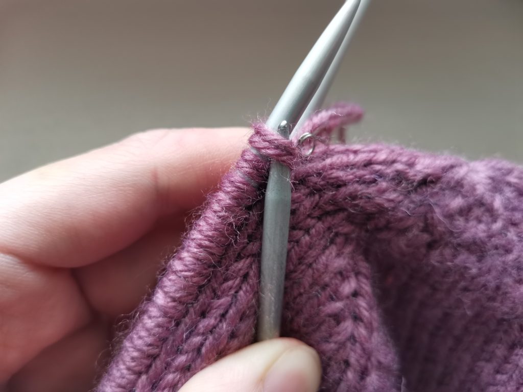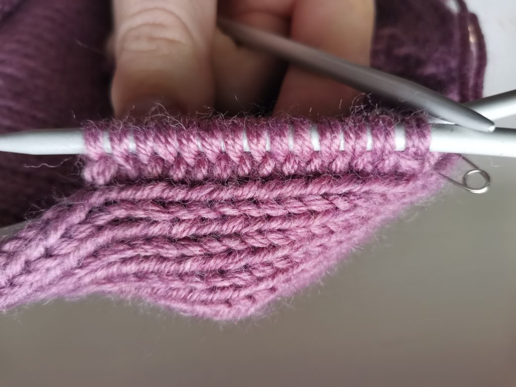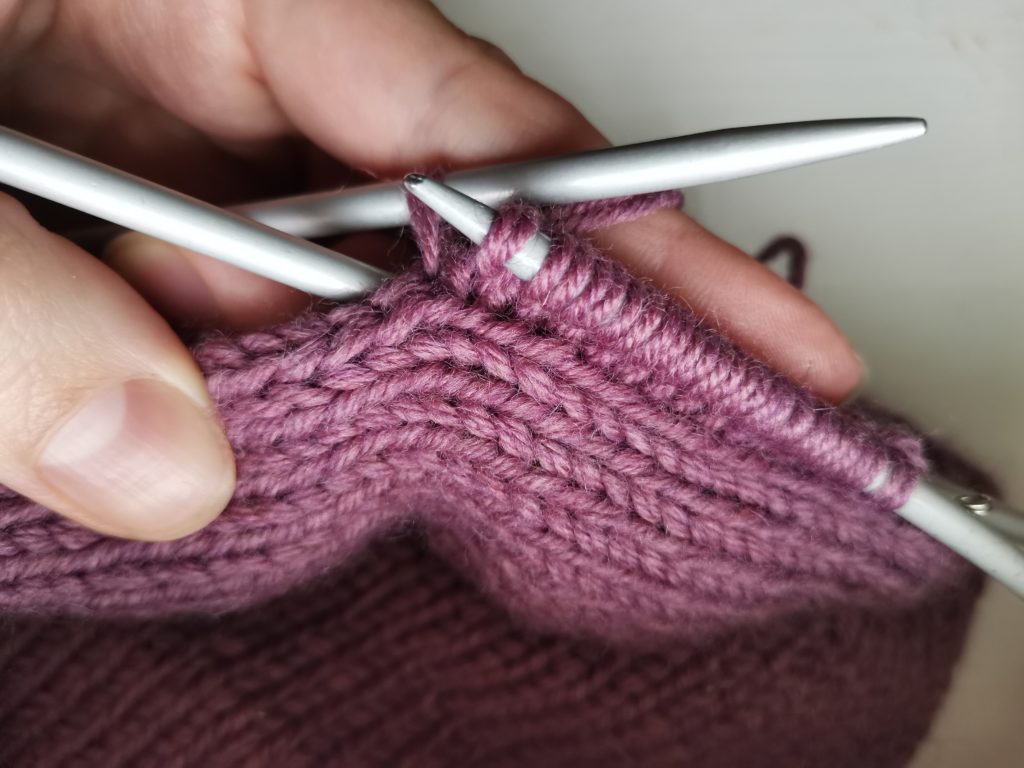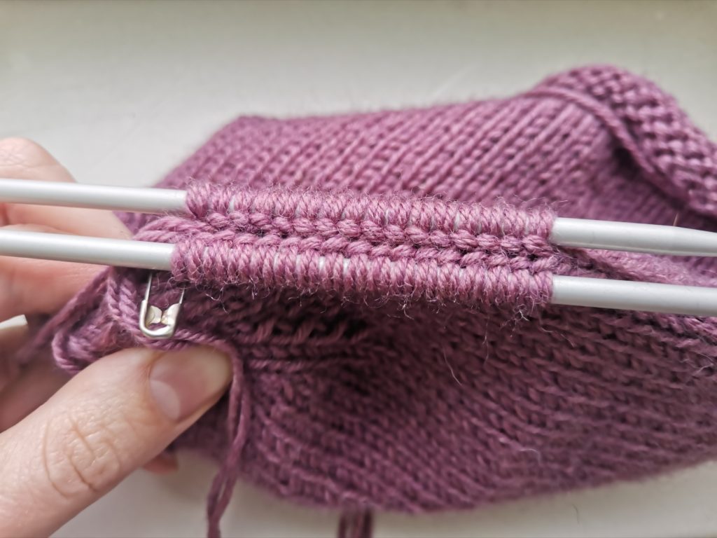 • Каждую пару петель провяжите ЛП. После убавления на спице 78 петель.