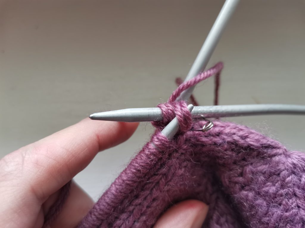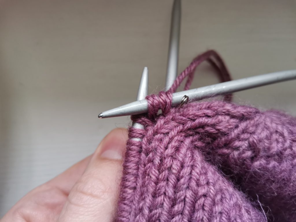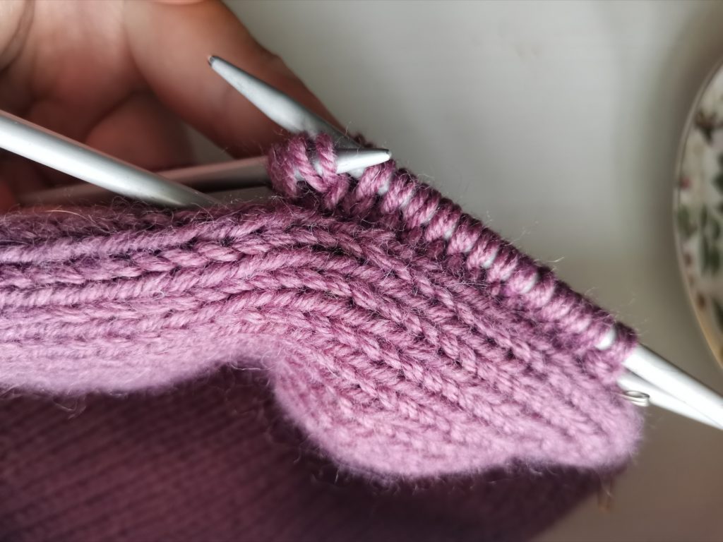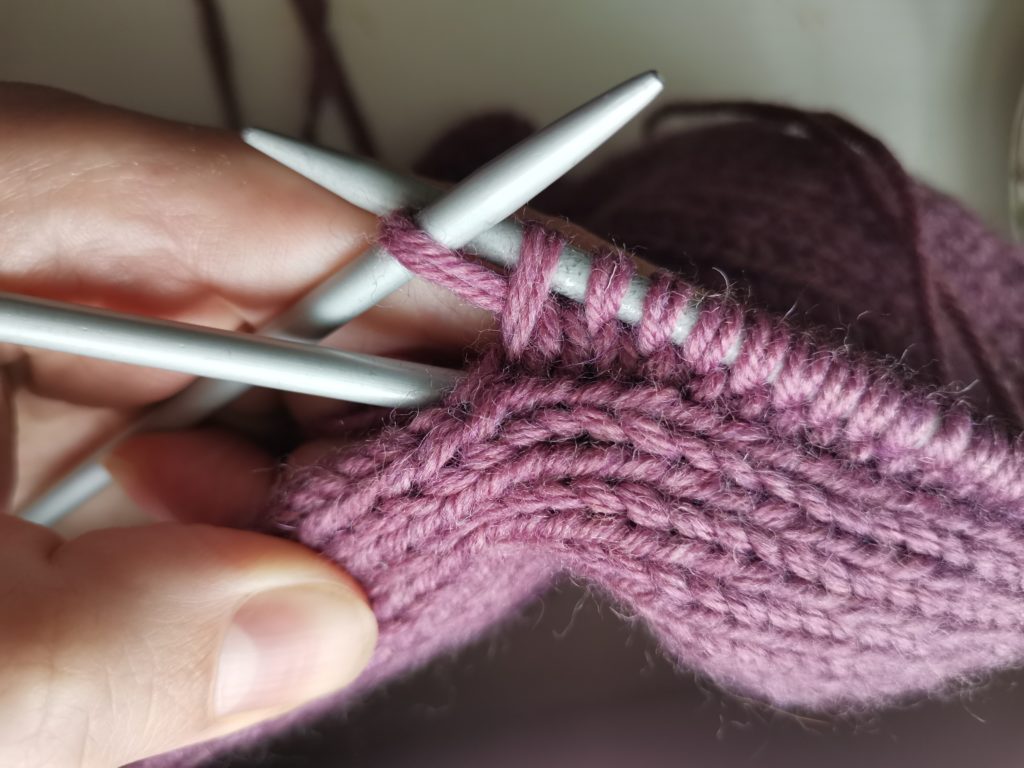 • Каждую пару петель провяжите ЛП. После убавления на спице 78 петель.