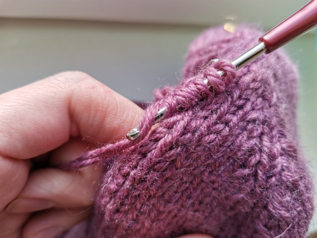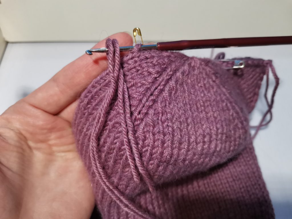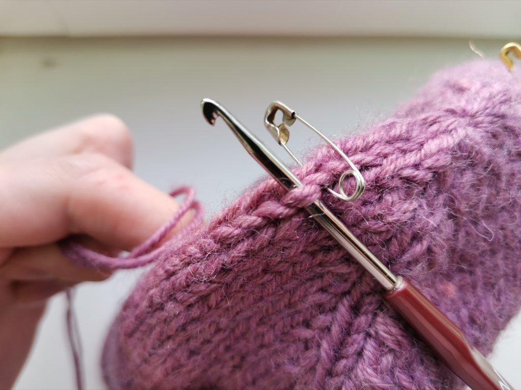 Продолжаю протягивать крючком и поочередно надеваю на спицу. Провязала 16 петель. Переворачиваю шапку.