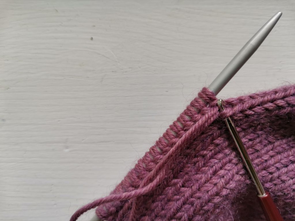 Вязание резинки: вязать 2 лицевых, 2 изнаночных петли повторяющимся рядом до достижения желаемой длины резинки. Рекомендуется вязать резинку примерно на 2,5 см.