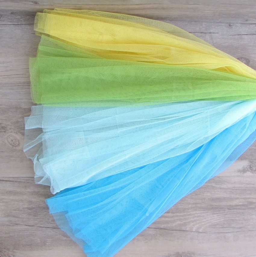 - Раскраиваем фатин по необходимой длине. Поскольку у нас юбка разных оттенков, то собираем каждого цвета по отрезу. Если юбка планируется однотонной, фатин все равно делится на отрезы.