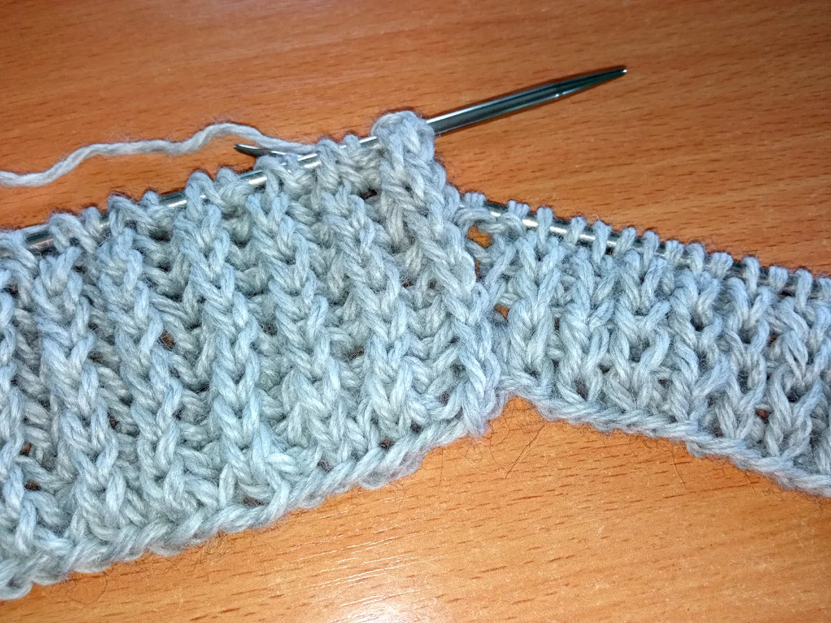 - Первый ряд: чередование за заднюю стенку двух изнаночных и двух лицевых петель;