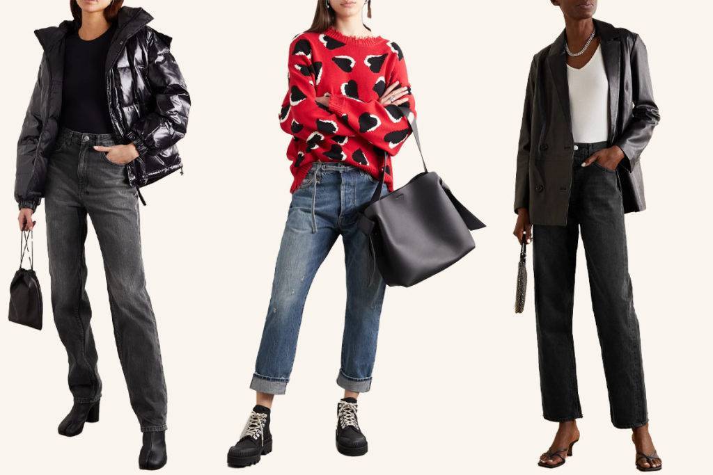 Классический силуэт — прямые джинсы со средней посадкой. В магазинах обычно обозначают, как regular fit (прямой силуэт до колена) и straight leg (прямой силуэт от колена до низа джинсов). Довольно универсальный вариант. Единственное, девушкам с прямоугольной фигурой (плечи равны бёдрам и слабо выражена талия) надо быть с ними аккуратными, чтобы не выглядеть, как столбик. Для этого можно добавить объёма сверху, либо баску от линии талии, либо выделить талию и надеть растёгнутый второй слой, как на примере ниже.