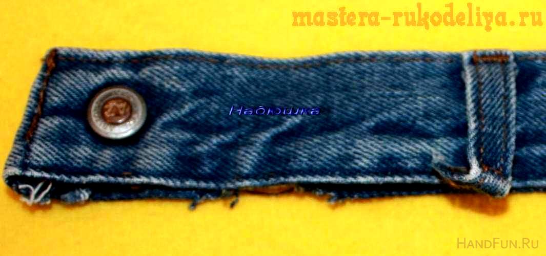 По спинке идет лента в обрасти поясницы. Выкраиваем ее из оставшихся джинс, обстрачиваем.