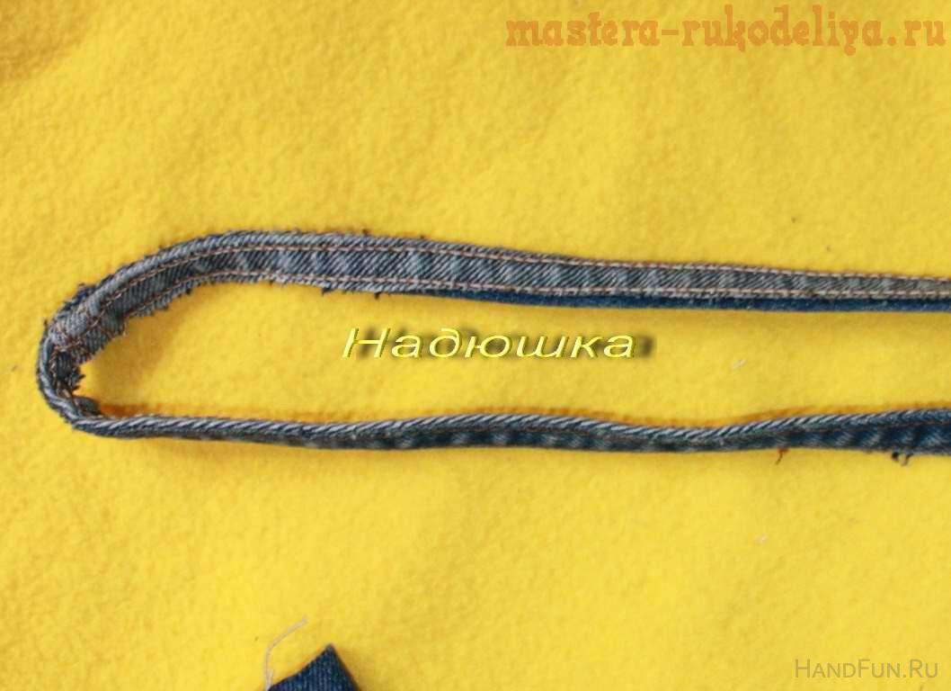 - Край джинсовой полоски наметаем и затягиваем нить, получился небольшой круг. Его также пришьем к заготовке.