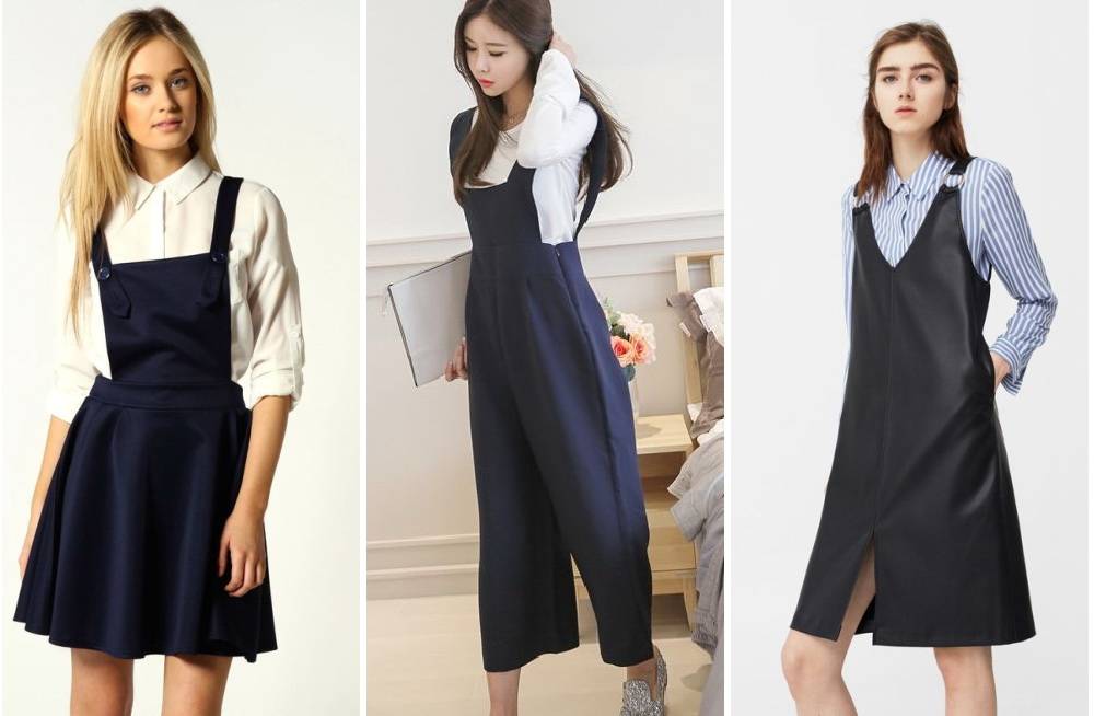 Деловой сарафан в клетку в 2019 году носят исключительно с однотонной блузой, а вот скромный серый или классический черный сарафанчик можно «разбавить» блузой в полоску или рябой водолазкой. – идеальный вариант для теплого сарафана, но не стоит путать ее с тонким свитером, который под сарафан не надевают. Если на вас – шерстяное платье на бретелях, выбирайте топ из тонкой ткани, а с пуловером из джерси лучше всего будет сочетаться джинсовый сарафанчик.