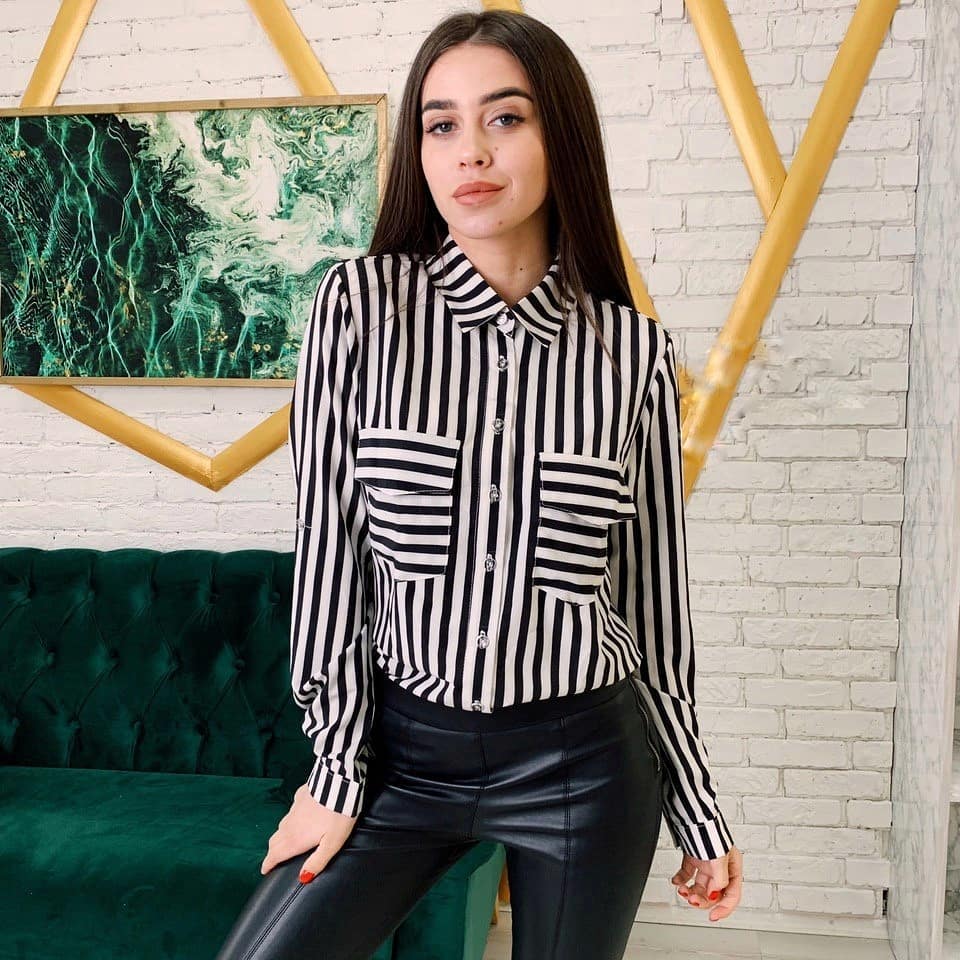 Для стройных девушек пойдет блузка классического варианта простого кроя в черно-белой полоске. При этом не имеет значения расположение полосок, и вертикальные и горизонтальные рисунки будут смотреться гармонично;