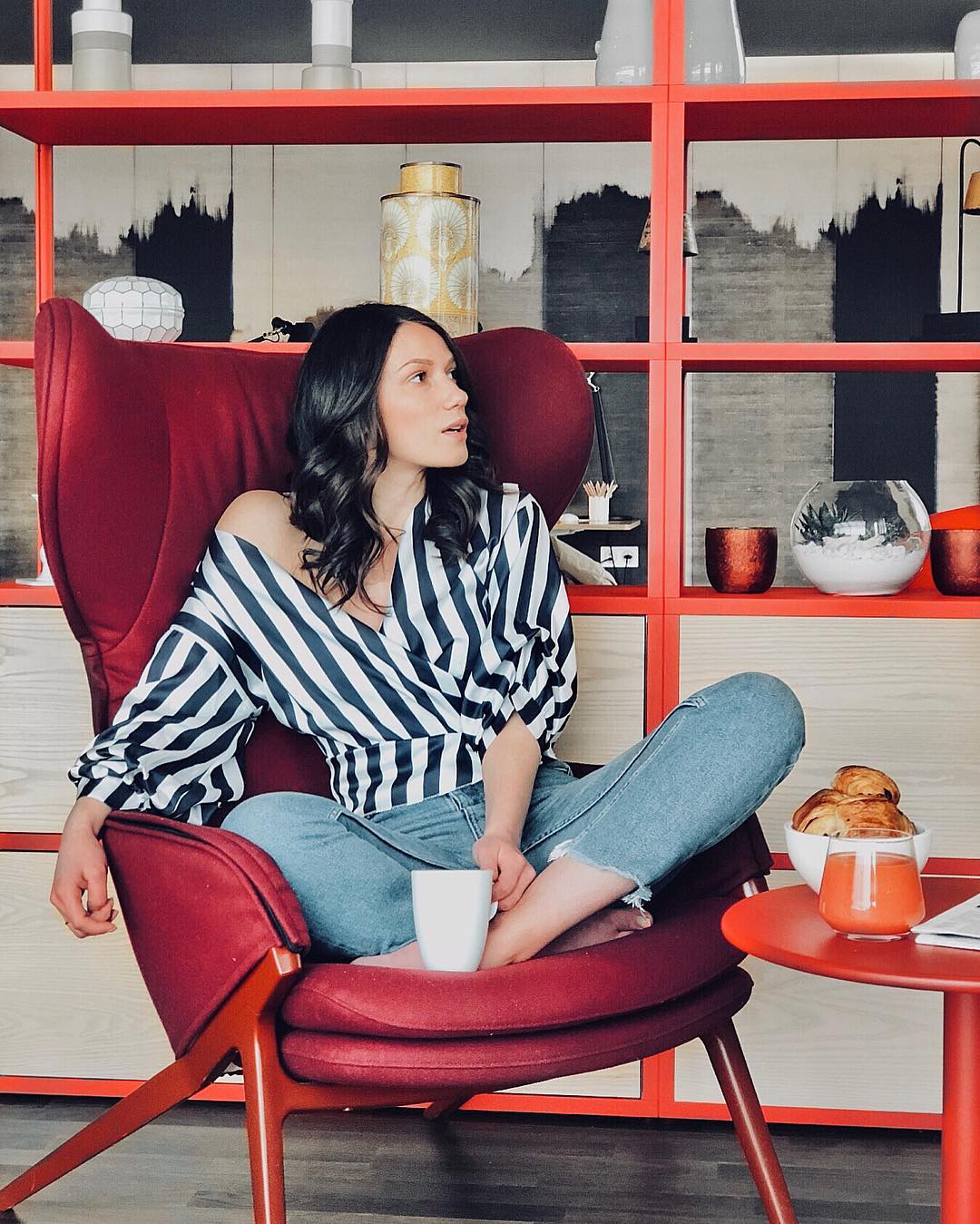 - Голубые джинсы наденем с красно-белой свободной тельняшкой. К этому яркому комплекту выберем красные босоножки и светло-бежевую сумку, образ может дополнить белая бейсболка.