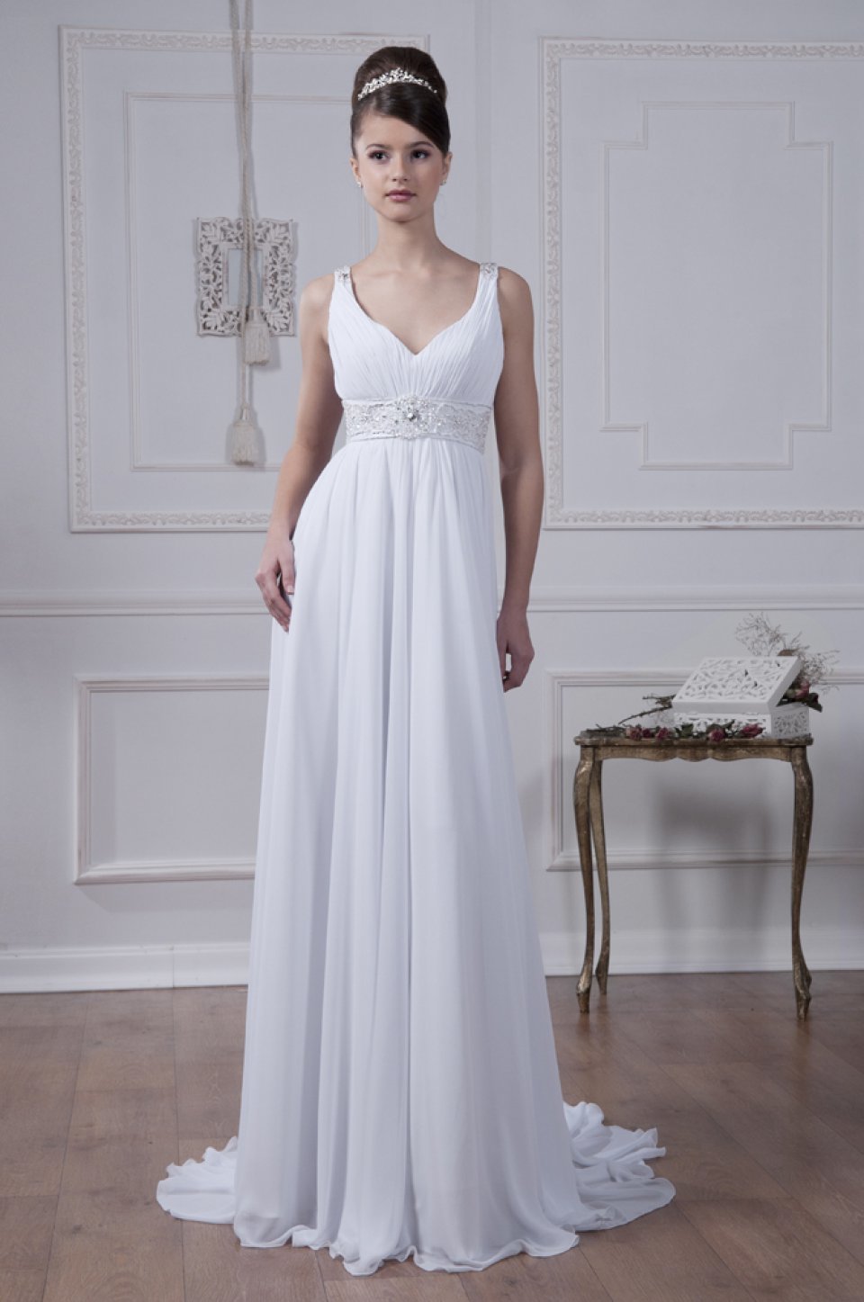 Платье отличается линией талии, которая слегка приподнята, а также лёгкой нижней частью в виде летящей юбки. Модель довольно простая, шьют её с использованием лёгких летних тканей, таких как шёлк или шифон. Наряд подходит для всех девушек, вне зависимости от типа фигуры. Он подчеркнёт грудь и скроет недостатки живота. Именно поэтому модель популярна среди беременных невест. Небольшой животик останется незамеченным. Платье подойдёт для девушек с невысоким ростом, а также для невест, которые хотят выбрать свободный наряд, не сковывающий движения.
