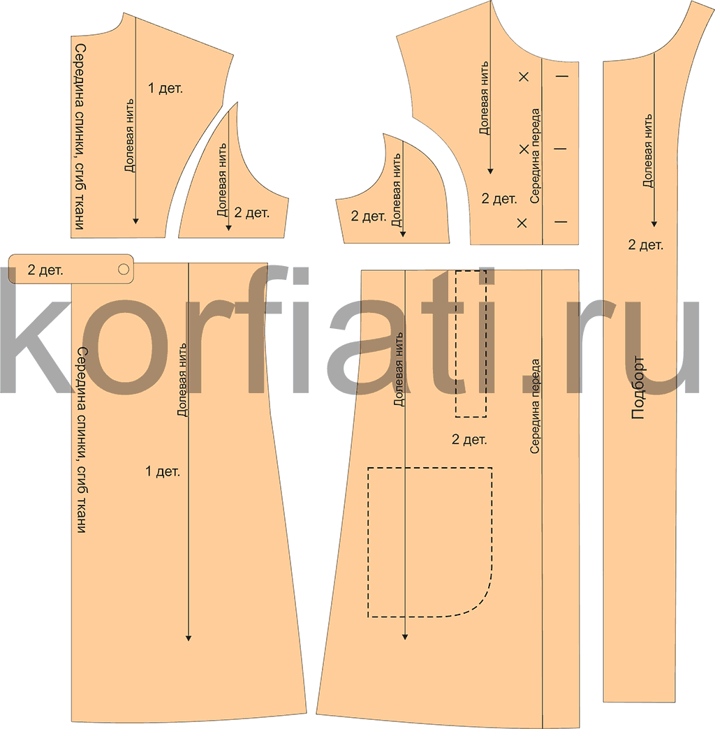 Сметайте и стачайте верхние средние и боковые части переда и спинки, стачать, отутюжить. Как правильно заутюжить припуски смотрите в нашем мастер-классе. На средних и боковых нижних частях переда выполните Карманы с накладной листочкой, настрочить накладные карманы.