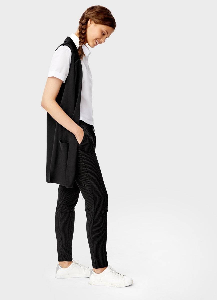 Смело комбинируйте зауженные строгие брюки и белые офисные блузки с чёрным, коричневым или серым удлинённым жилетом классического кроя. Это сочетание идеально впишется в рабочую атмосферу, а также подчеркнёт ваш вкус и сделает образ оригинальным, но уместным. Это отличная замена для скучного пиджака, лишённого индивидуальности. В качестве обуви выбирайте классические лодочки на тонком каблуке. Ничто иное не будет сочетаться с подобным комплектом.