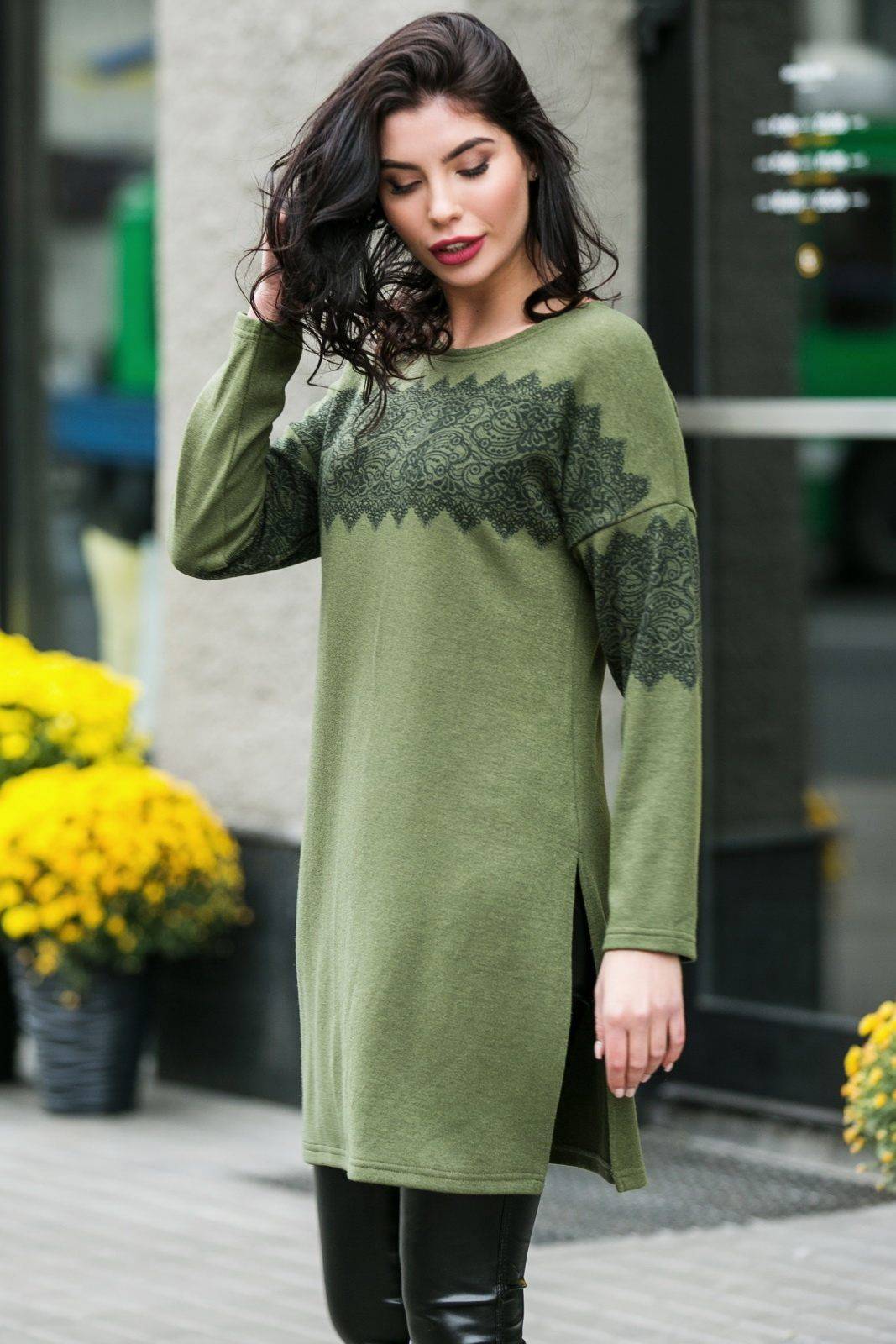 Трикотажное платье-туника. Очень актуальный вариант женского наряда, который идеально гармонирует и сочетается с большинством одежды. Подобные наряды могут быть пошиты как с рукавами, так и без них.