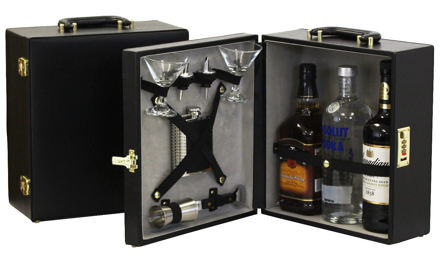 - Компактность. Все помещается внутрь – алкоголь, штопор и бокалы.