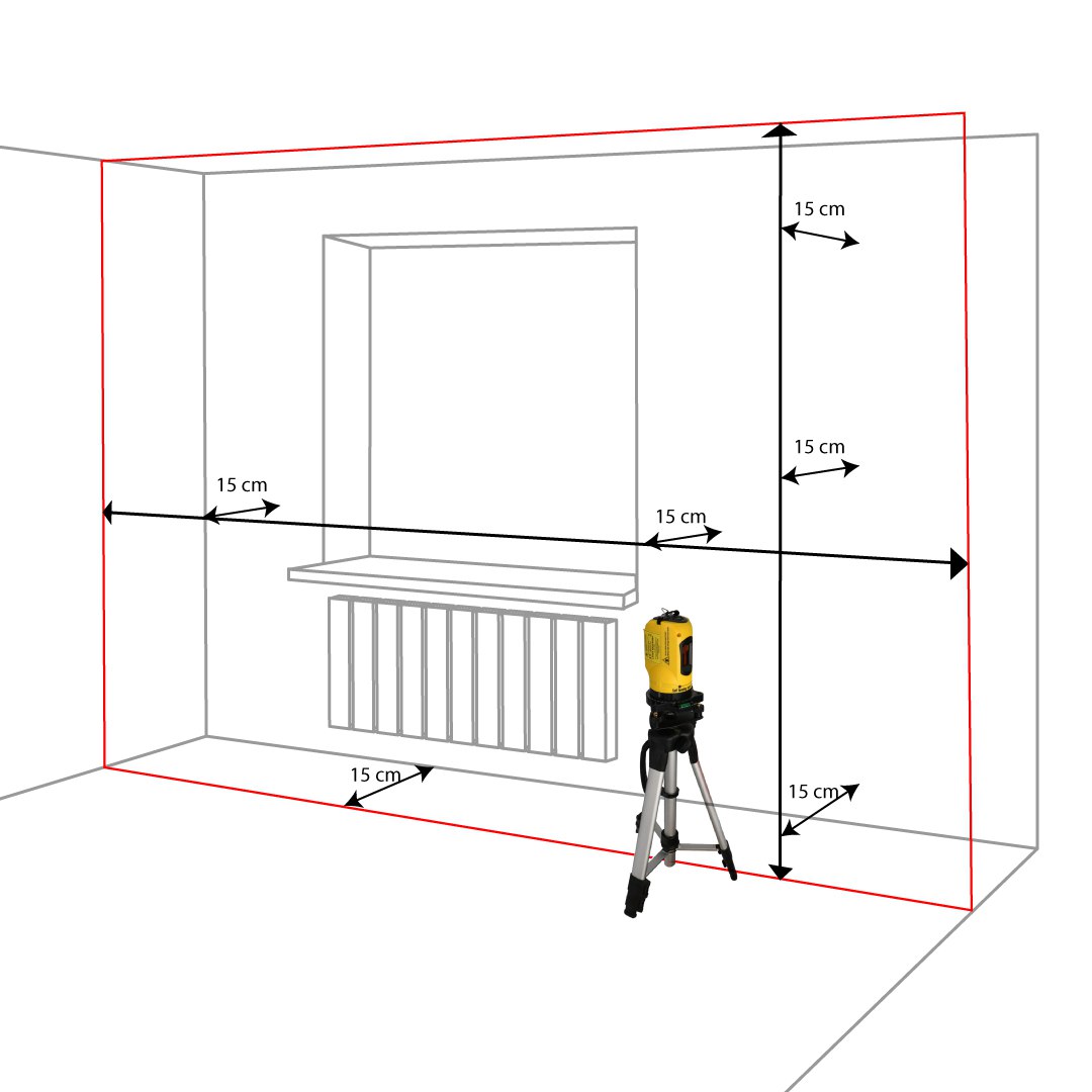 - 5. Лазерные лучи должны совпадать с вашими отметками в 15 см у основания стены. Проходить ровно сквозь них. Если сразу этого не случилось, немного подвигайте нивелир.