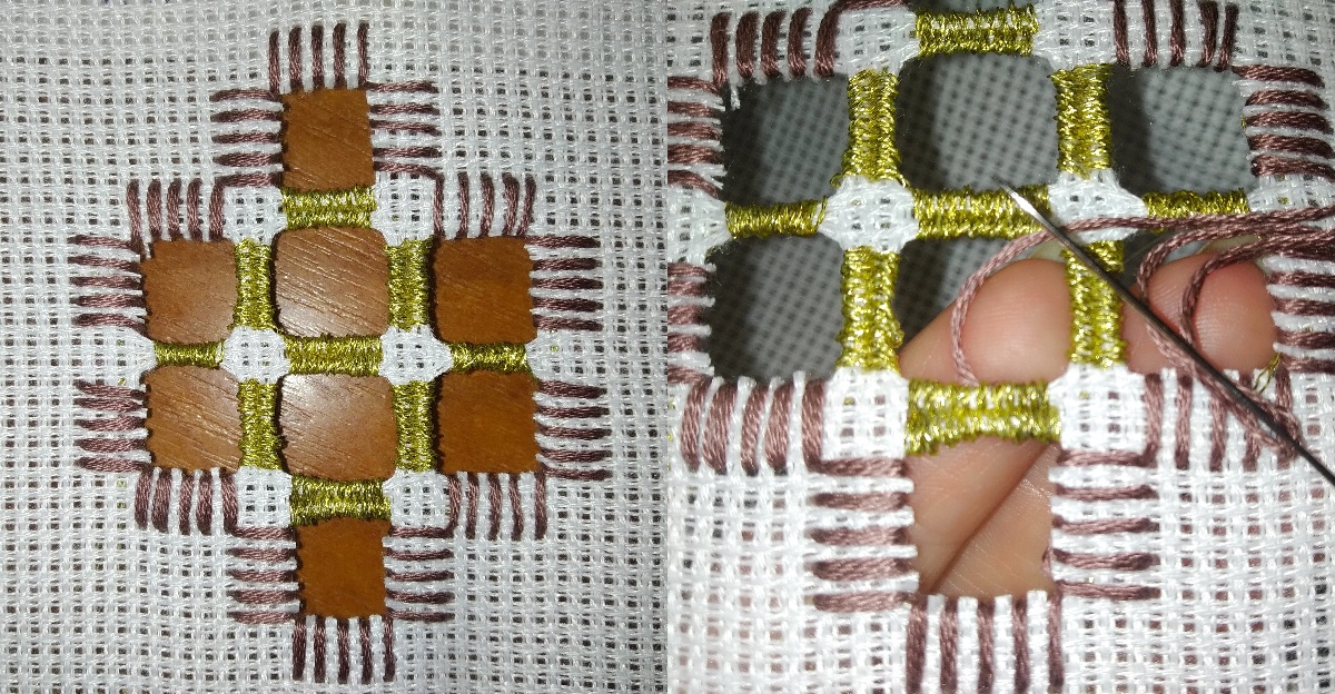 Переходим на другую сторону квадрата и повторяем процесс. Когда первый квадратный ряд завершен, можно приступать ко второму. Принцип исполнения тот же, но здесь стежки будут располагаться не вертикально, а горизонтально. Нить необходимо заводить под стежки в одну сторону, а затем через нитку – в другую. Дальше вышиваем уголки. Вводим нить в центр, затем в угол маленького квадрата, снова в центр – делаем стежок через одну клеточку. С помощью таких стежков заполняем все пространство квадрата