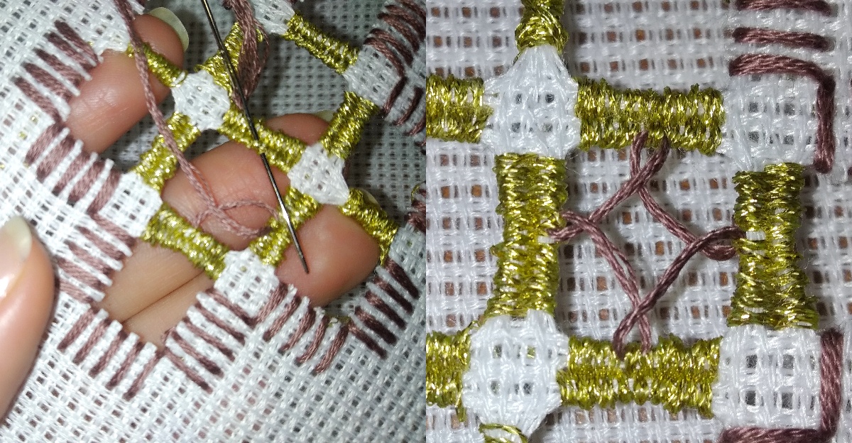Их вышивают в расчёте 5 швов на 4 клеточки. Следующий ряд стежков должен быть перпендикулярен первому. То есть, если первый ряд идет горизонтально, то второй ряд вышивается вертикально.