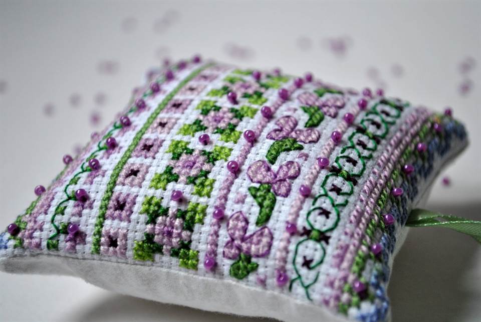 Из образовавшихся дырочек нужно вытащить нитки. Если ткань накрахмалена, то сначала процесс может пойти туго. Нити вынимаются сначала в одном направлении, потом в другом, чтобы в итоге получилась решеточка. Затем закрепляем узелок и выводим нить слева от решетки, обвиваем все нити решетки, делаем переход под новые и снова обвиваем. После этого переходим под столбик на изнанке. Игла входит в центр столбика и осуществляет проколы к середине по очереди справа и слева. Таким образом обшиваем все столбики. Полученный квадрат можно украсить цветочным швом и швом, имитирующим машинную строчку. Вышитое полотно соединяем с тканью, сшиваем уголки и набиваем поролоном или ватой. Прикрепляем ленту и украшаем бусинами. Игольница готова к эксплуатации!