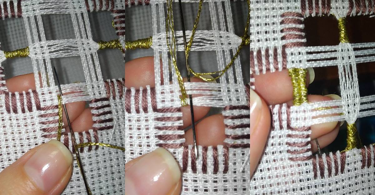 Воздушные петли получаются за два шага. Сначала вы выполняете штопальный стежок по всем граням пустого квадрата. Воздушная петля делается внутри получившегося пустого окошка вышивки в технике хардангер. Вы проводите нить под средней ниткой обвивки одной из сторон.