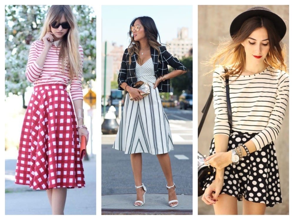 - Микс. Смешивайте принты. Старайтесь придерживаться единой гаммы в оттенках, но смело можете надевать в одном комплекте юбку с маками и футболку в горошек, брюки в полоску и блузу с розами, платье с ромашками и тренч в клетку.