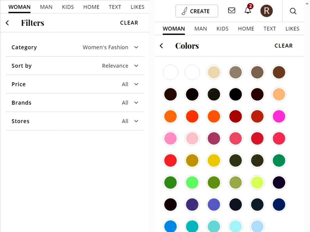 Для создания коллажа нажмите на «CREATE» (Создать) в правом верхнем углу. Откроется графический редактор, и тут придётся поломать голову. Потому что нет привычного рубрикатора по одежде, обуви и аксессуарам. Есть разделения на категории Woman (женская одежда), Man (Мужская одежда), Kids (товары для детей), Home (товары для дома), Text (шрифты), Likes (понравившиеся изображения), My items (мои предметы), Others (другое). Нет выборки по видам одежды, обуви и аксессуарам. Поэтому, если вам нужно найти что-то конкретное, то нужно вбить в строку поиска название этой вещи. Например, для поиска кожаной куртки вводите в строку поиска «leather jacket».
