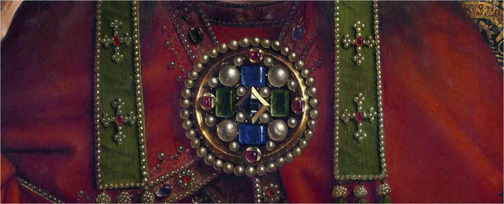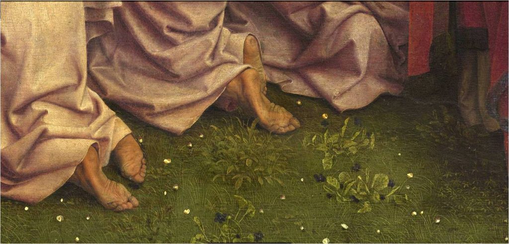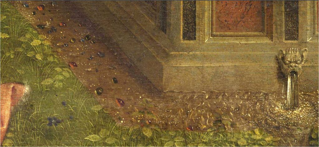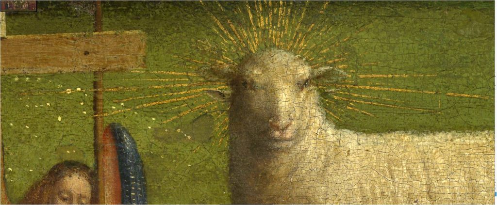 Единство богословской программы внутренней части алтаря обеспечивает вертикальная ось. Над Христом, изображенным в виде закланной жертвы, возвышается образ Христа-первосвященника и Бога. Полы Его мантии окаймляет вышивка со словами из Откровения Иоанна Богослова: «Царь царствующих и Господь господствующих». Знаки царской власти – знак его пасхальной победы. Это тот же самый Христос. Его кровь, истекающая в чашу, изливается в мир как вода жизни, утоляющая всякую жажду. Струя воды, вытекающая из фонтана, изображена на уровне глаз молящихся, вовлекая каждого во внутреннее пространство этой мистерии. Капли воды у основания фонтана превратились в драгоценные камни, как застывшие капли крови. По одной вертикали ван Эйк расположил голубя, агнца и восьмиугольный фонтан, графически выражая мистическое богословие Иоанна Богослова. Это символы трех «свидетелей»: Духа, крови и воды (1 Ин 5:5–12).