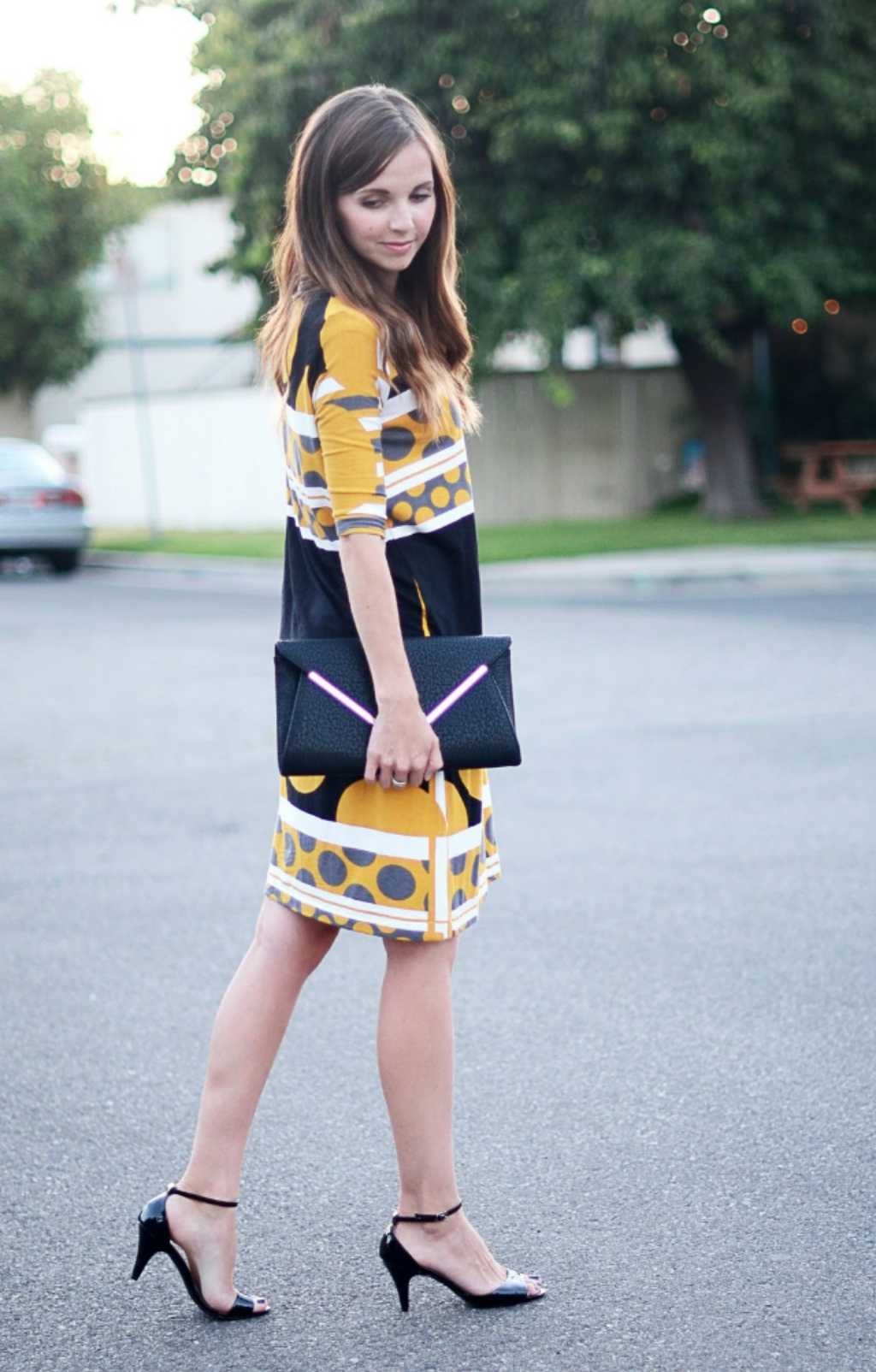 Для пошива такого платья, лучше всего выбрать трикотаж, который хорошо тянется. Геометрический рисунок и контрастные цвета помогут скрыть небольшие огрехи.