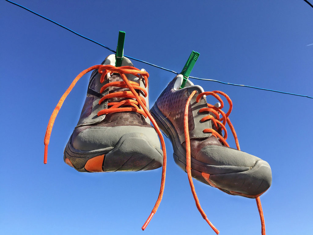 - Развяжите шнурки, вытяните язычок. Максимально раскройте обувь, чтобы она хорошенько продувалась изнутри.