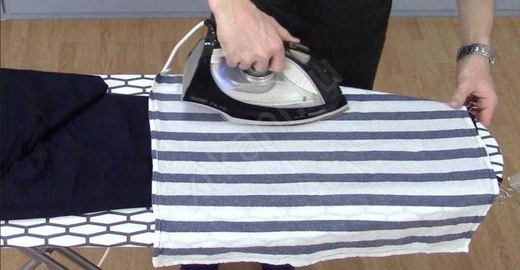 Если вы гладите на столе, тогда вложите в брюки небольшую подушечку или сложенное в несколько раз полотенце. Этого будет достаточно, чтобы выгладить весь верх.
