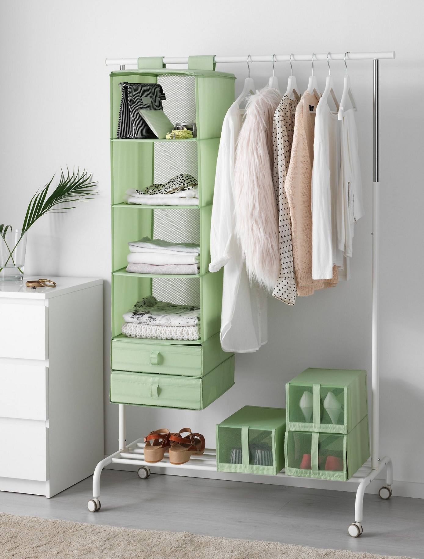 Простой способ хранения — положить каждый пакет в отдельную коробку. Вы можете купить корзины для хранения. Единственная проблема заключается в том, что трудно найти подходящий размер. Остается свободное место или приходится сжимать и складывать предмет. Жесткие стенки также негативно влияют на сохранение формы.