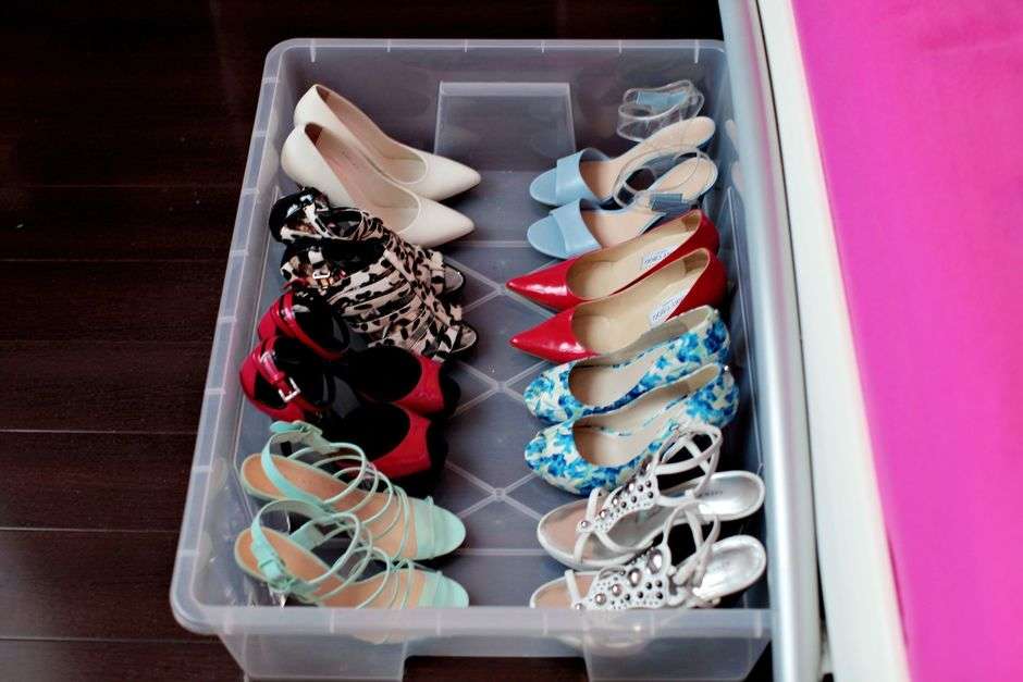 Большую же часть своей обуви я храню под кроватью. Сначала у меня было две прозрачные коробки с аккуратно расставленными черевичками (на фото ниже — моя гордость: идеальный порядок), потом места стало не хватать, и в итоге все пространство под кроватью занято четырьмя коробками. В одной — летние балетки и обувь без каблука, в другой — обувь на выход, в третьей — осенние сапоги, в четвертой — кроссовки и кеды. Если у вас есть место под кроватью, не давайте ему простаивать зря!