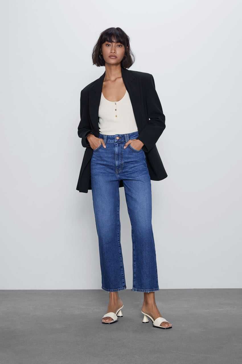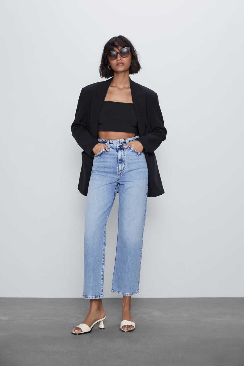 В деловом стиле с «трубами» можно носить не только блузки, но и различные жакеты и пиджаки. Для баланса фигуры к «трубам» идеально подойдет укороченный жакет длиной до линии пояса джинсов.