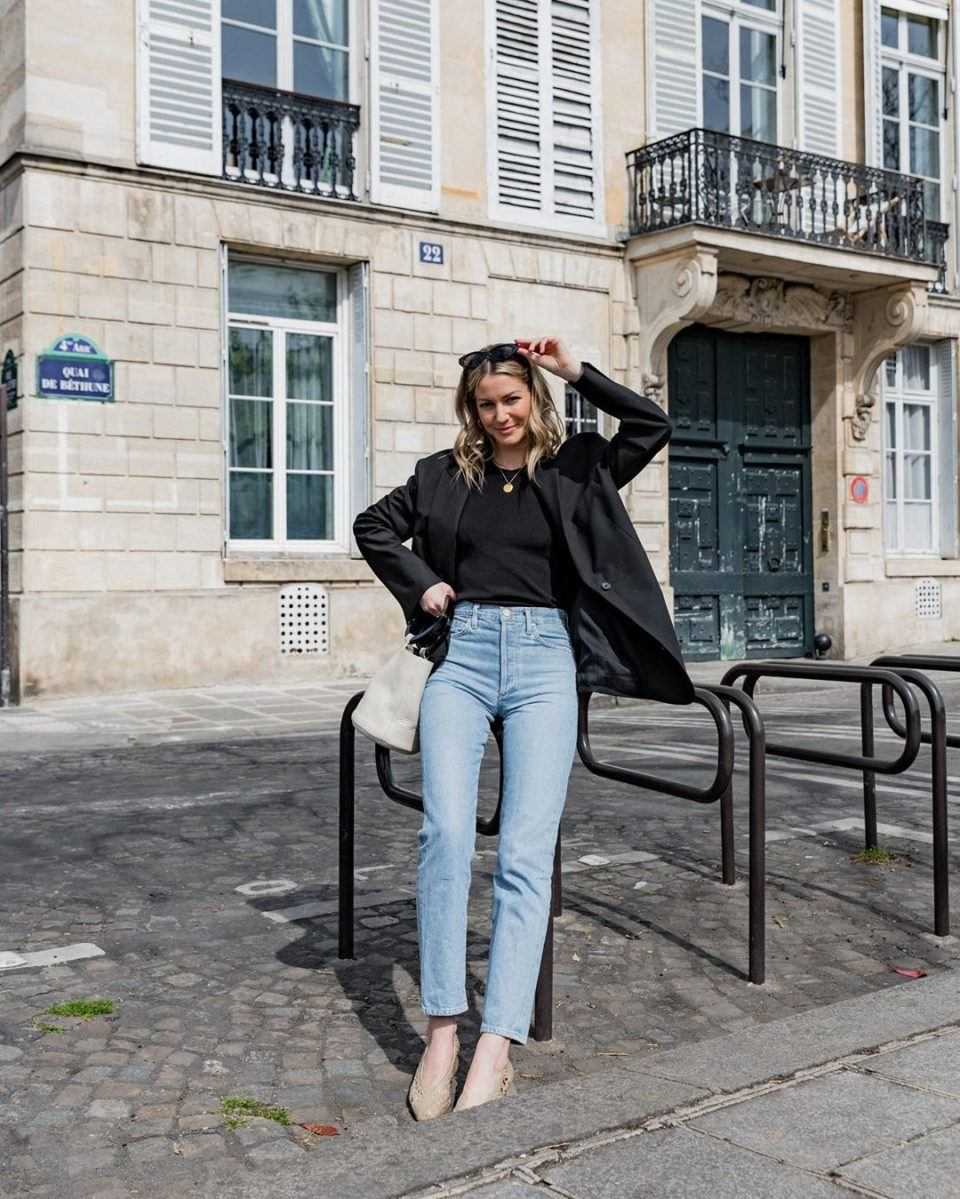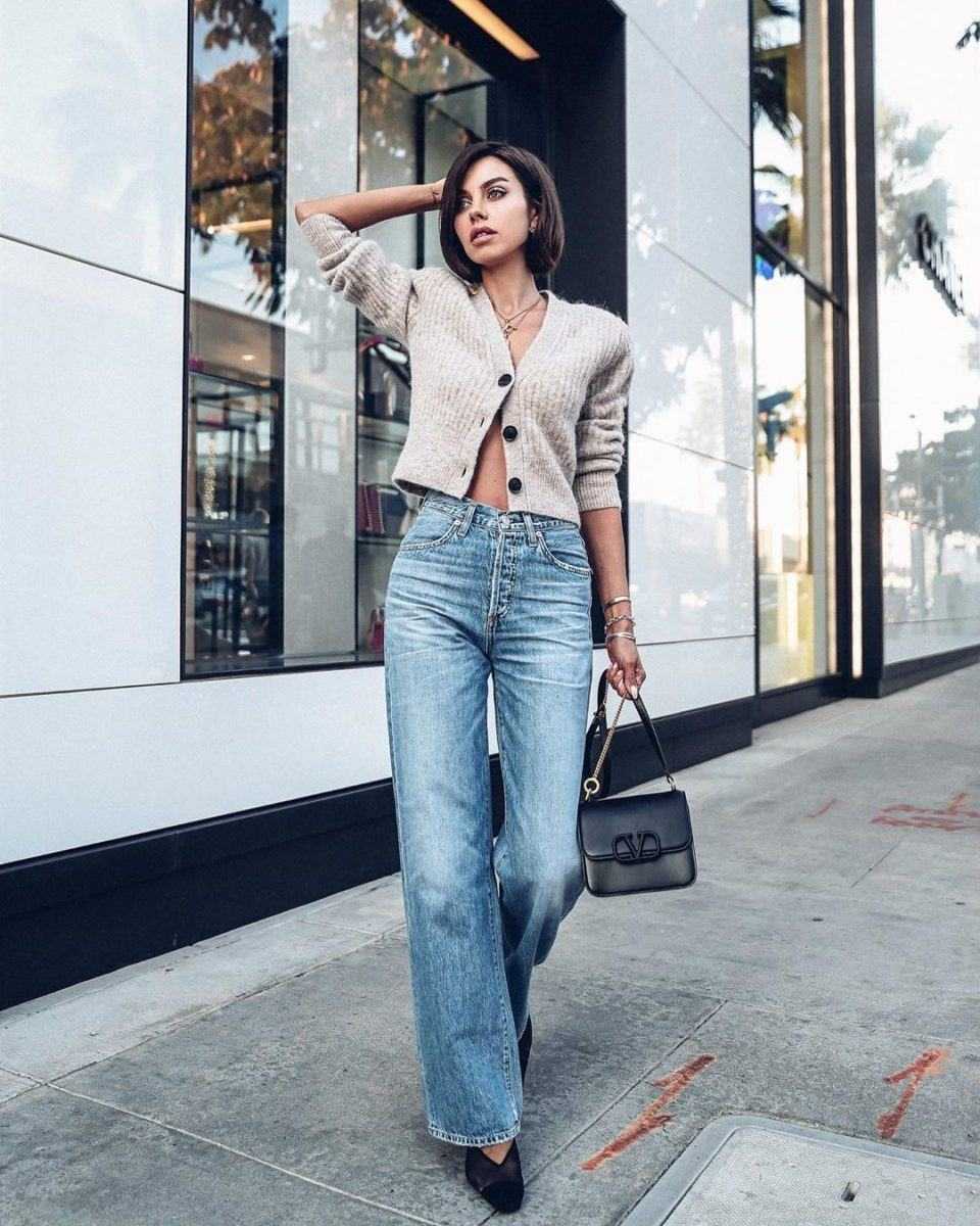 Самый красивый образ всегда имеет гармоничные линии. Джинсы-трубы за счет широкой нижней части требуют баланса, что обеспечивается правильно подобранным «верхом».