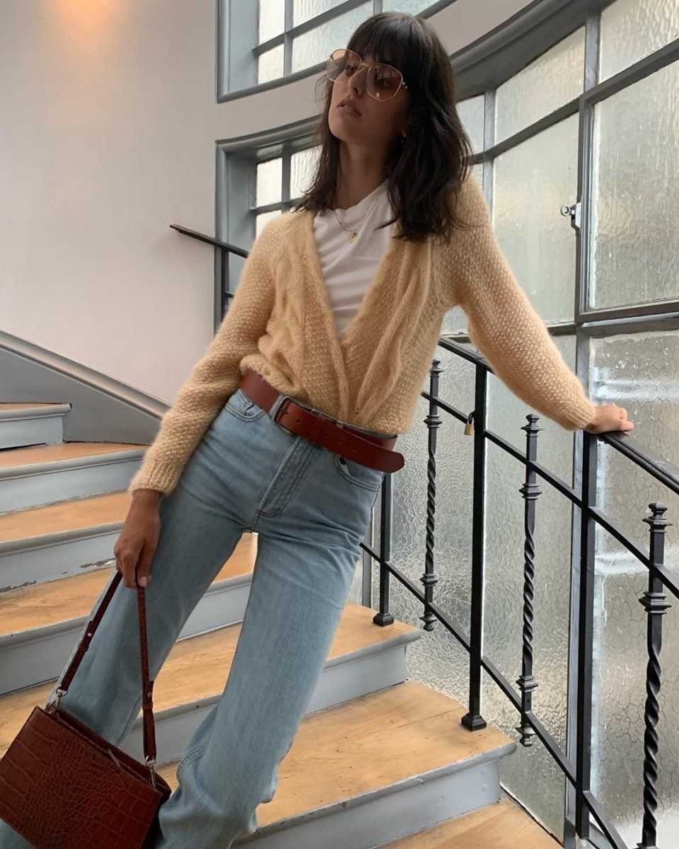 Если вы хотите создать образ, сочетая «трубы» с тонким кардиганом или другой вещью из свободного трикотажа, сделайте это по аналогии с блузкой или рубашкой, — заправьте кардиган под пояс джинсов. Кстати, необязательно делать это «по кругу». Достаточно заправить вещь только спереди, обозначив линию талии и бедер.