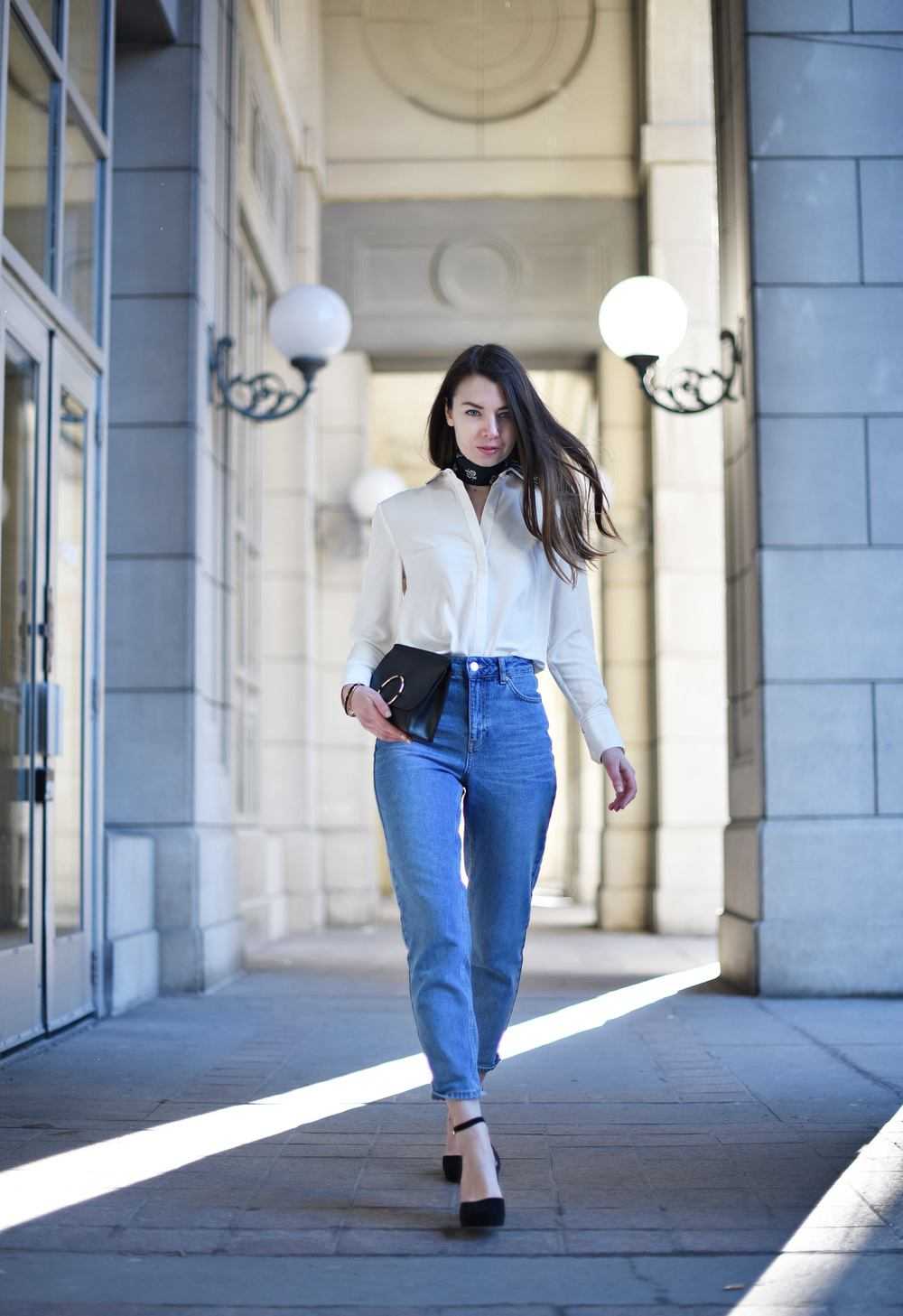 Прямые джинсы с высокой талией предпочтительно сочетать с простыми, лаконичными вещами. Такой образ идеально подходит для повседневной жизни. Впрочем, при желании всегда можно создать более смелое, необычное сочетание. К примеру, джинсы прямого кроя и классическая рубашка с оригинальными вставками. Не забудьте об аксессуарах, но помните, что их должно быть не много. Стильный, элегантный образ готов!