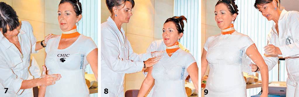 Работать следует аккуратно и осторожно, поскольку в области проймы бинт нужно располагать максимально гладко. Кроме того, бинт в области груди и проймы нужно уложить толстым слоем, чтобы при снятии гипса эта область не деформировалась