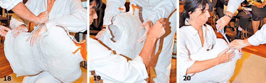 6. На снятом манекене разрезы аккуратно заклеивают гипсовыми бинтами и дают гипсу высохнуть. Поскольку застывший гипс в силу естественных причин несколько увеличивается в объеме, с боков можно срезать по 1 см (илл. 18—20).