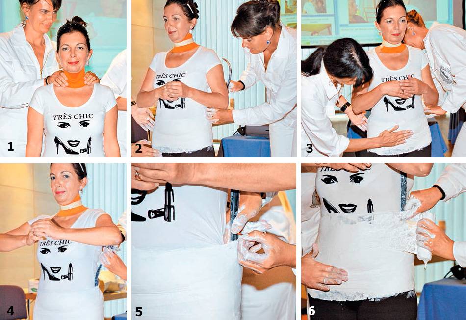 Начиная с бедер, тело обматывают бинтами, двигаясь снизу вверх. Обматывать следует равномерно по всей поверхности фигуры и плотно, разглаживая слои и дополнительно увлажняя бинт при необходимости.