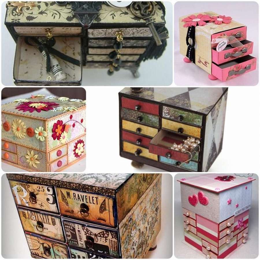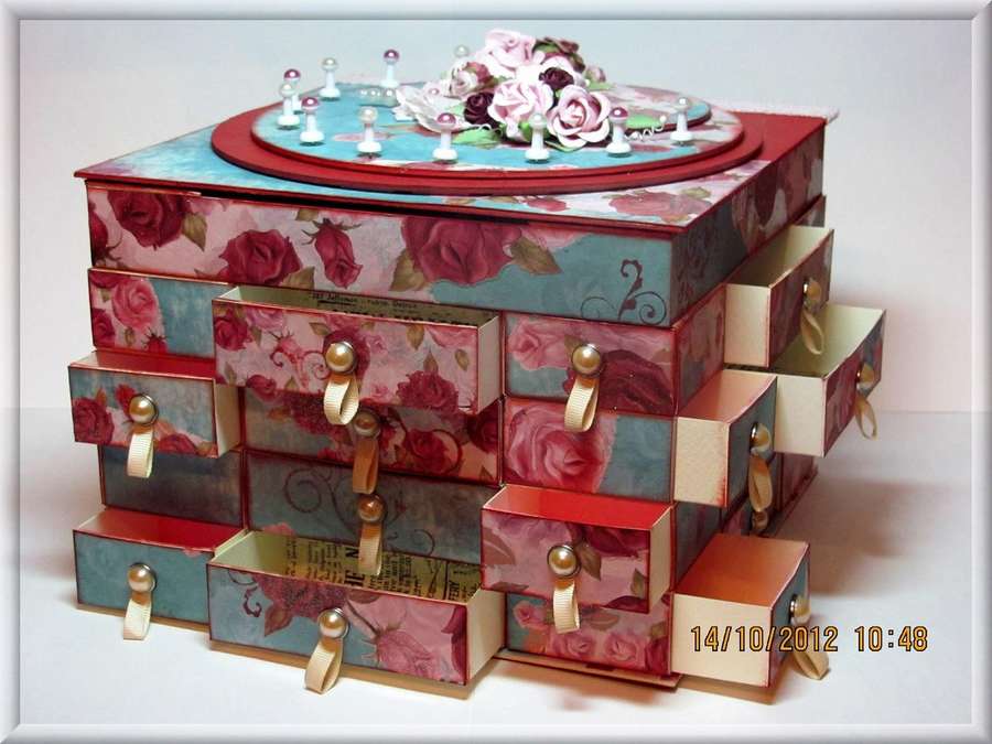 Не шкатулка, а целый склад для хранения украшений или других мелочей, которые могут пригодиться. Здесь коробки располагаются не строго в одном направлении, а то широкой стороной, то узкой. Выглядит очень оригинально.