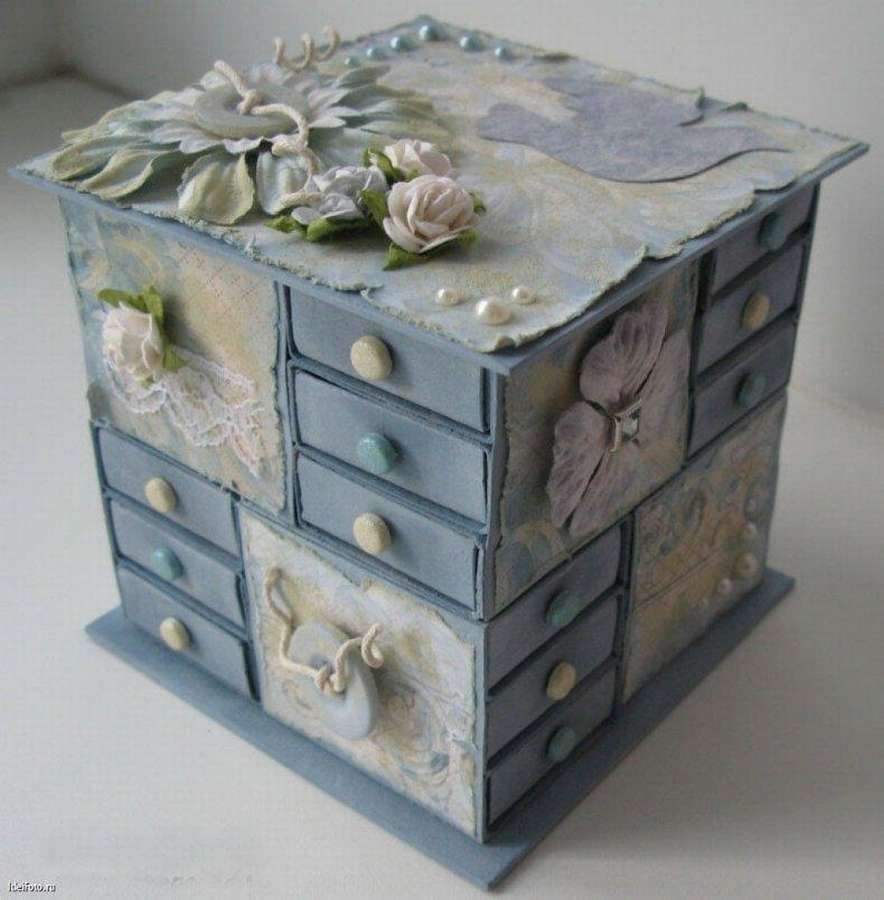 Оригинальная шкатулка, где количество ящичков зашкаливает. Но принцип работы такой же – склеиваем все коробки в определенном порядке и декорируем тканью, кружевами и цветами искусственными.