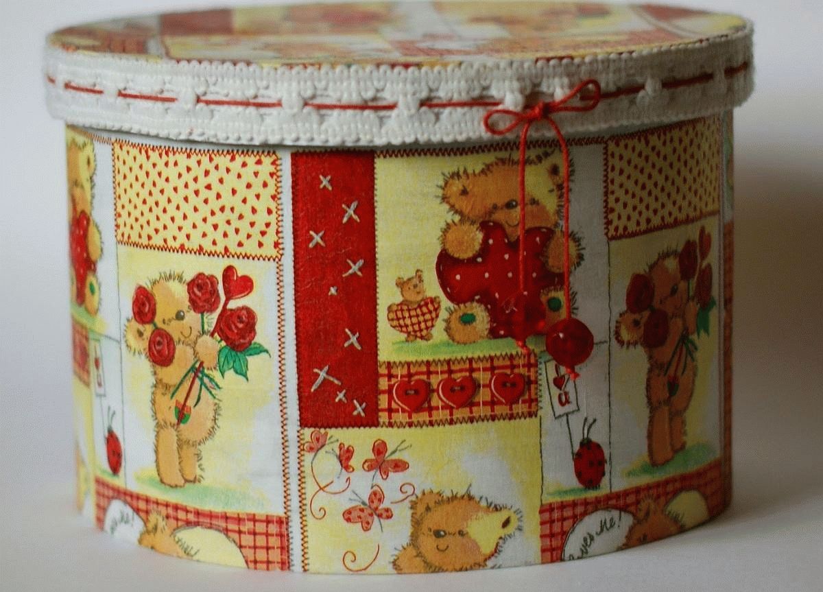Вариант с украшением изделия тканью выглядит невероятно мило и трогательно. Такая коробочка дополнит ваш интерьер и добавит в него нотку романтизма.